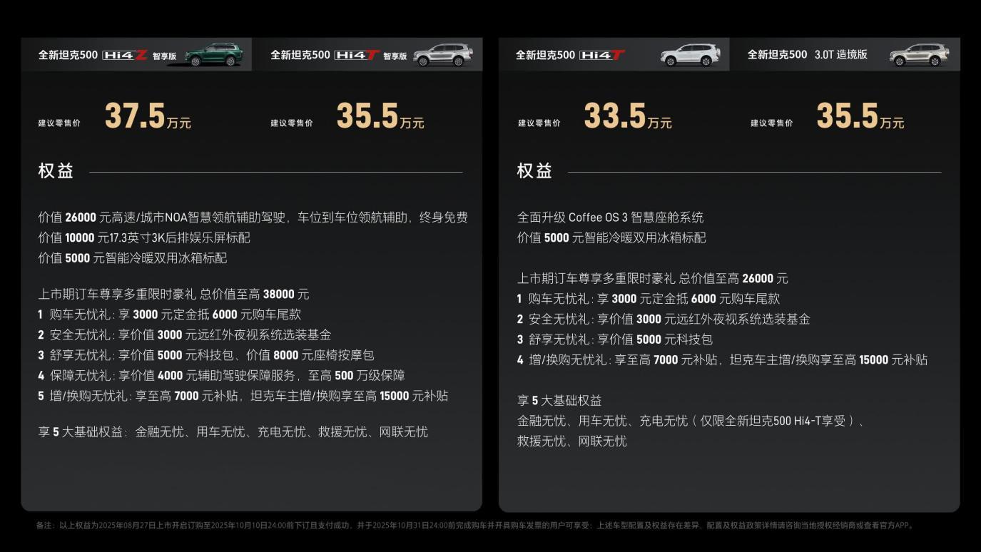 此次上市,坦克品牌还推出丰厚权益,智享版用户可享总价值41000元的标配配置,上市期订车有至高38000元限时豪礼,非智享版也有至高26000元限时礼包,另有金融、用车、充电等5大基础权益。