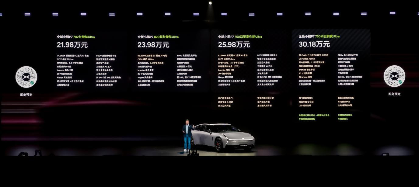 2025 年 8 月 27 日,小鹏汽车在广州智造中心举办全新小鹏 P7 上市发布会,这款定位未来 AI 豪华轿跑的新车正式亮相,共推出 702 长续航 Ultra、820 超长续航 Ultra、750 四驱高性能 Ultra 与 750 四驱鹏翼 Ultra 四款车型,官方指导售价分别为 21.98 万元、23.98 万元、25.98 万元和 30.18 万元。