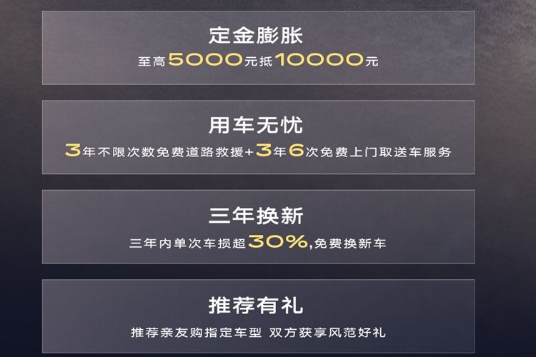 3,三年免费换新权益——指定车型单次车损超过30%即可免费置换等价新车。