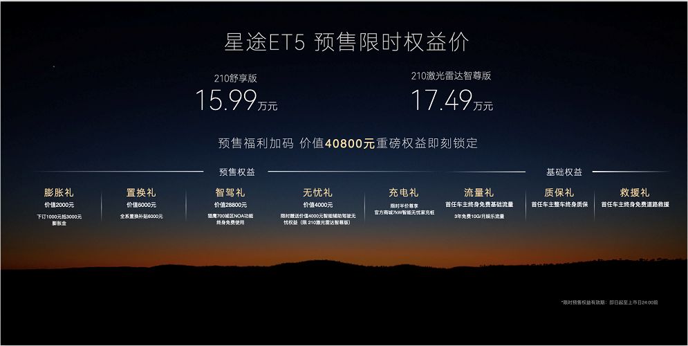 预售期间,星途ET5为下定用户准备了总价值高达40800元的重磅福利,多项预售专属礼遇现已开启:下订1000元可抵3000元购车款、全系6000元置换补贴、价值28800元的猎鹰700辅助驾驶功能终身免费、专属4000元智能辅助驾驶无忧权益限时赠送(限210激光雷达智尊版)以及官方商城7kW智能家充桩半价尊享。同时,星途还为首任车主提供三大基础权益,包括终身免费基础流量,3年10G/月娱乐流量、整车终身质保及终身免费道路救援服务,以满格诚意打造预售期用户的尊享购车体验。