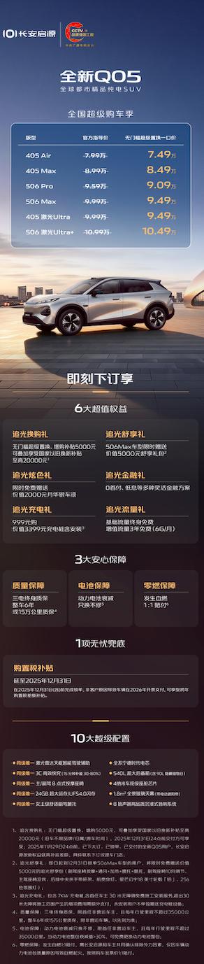 11月29日,长安启源全新Q05开启“超级购车季”,并宣布全面刷新用户购车权益,涵盖整车及三电系统的“三大安心保障”、购置税兜底政策延续至12月31日。同时,重磅推出全系无门槛超级置换、增购一口价,立省5000元,低至7.49万元起,并承诺对11月29日24点前“已下大订、已锁单,已交付”的用户,按照超级购车季新权益就高补返差额。