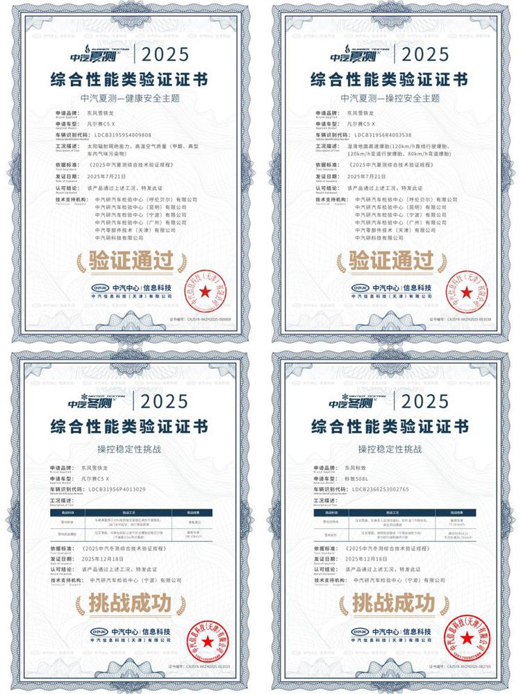 产品层面,神龙汽车旗下车型更经受住了严苛考验。在中汽中心进行的夏季高温测试中,东风雪铁龙凡尔赛C5 X凭借在健康和操控安全层面的卓越表现,勇夺“健康与操控双安全”权威认证,令业界瞩目;年末,东风雪铁龙凡尔赛C5 X与东风标致508L又在极寒驾控安全验证中,凭借卓越的操控稳定性双双斩获“操控稳定性挑战”认证证书,展现了法系底盘技术应对极端环境的深厚功底。这些权威背书,不仅验证了神龙汽车产品在极端环境下的可靠性与安全性,更强化了“法式驾控”与“安全可靠”的核心品牌价值,成为赢得用户信赖的基石。