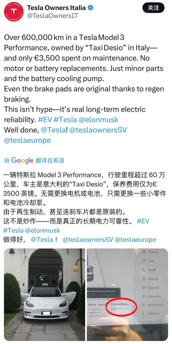 意大利出租车公司Taxi Desio使用的Model 3高性能版,创下原装电池行驶60万公里的世界纪录,且车辆状况依然良好。