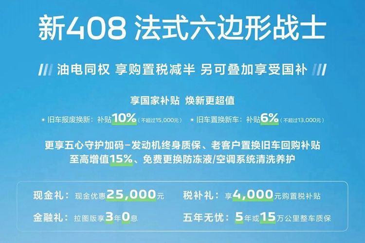 新春焕新之际,东风标致新408带来多重购车权益,以实力政策组合拳为用户带来实实在在的利好。车型专享高额现金礼遇与购置税减半,有效降低购车成本;针对新408龘龘款拉图版,更提供3年0息金融政策,让用户资金安排更灵活,轻松购车、无忧还款。搭配5年或15万公里整车质保与发动机终身质保,东风标致以“五心守护”服务,为每一位用户保驾护航。