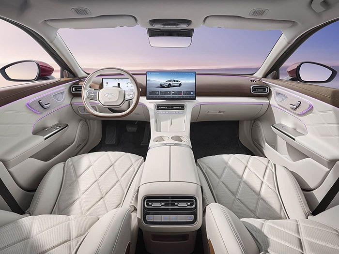 内饰方面,风云A9L同样采用简洁雅致的设计思路,让其符合中大型轿车的产品定位。具体来看,该车采用双辐式多功能方向盘、全液晶仪表、15.6英寸中控屏(内置车规级高通骁龙8255芯片,内置安全岛)等目前主流的车内配置,搭配趋于平直的中控台线条以及环抱式座舱设计,让其有着不错的视觉感受。