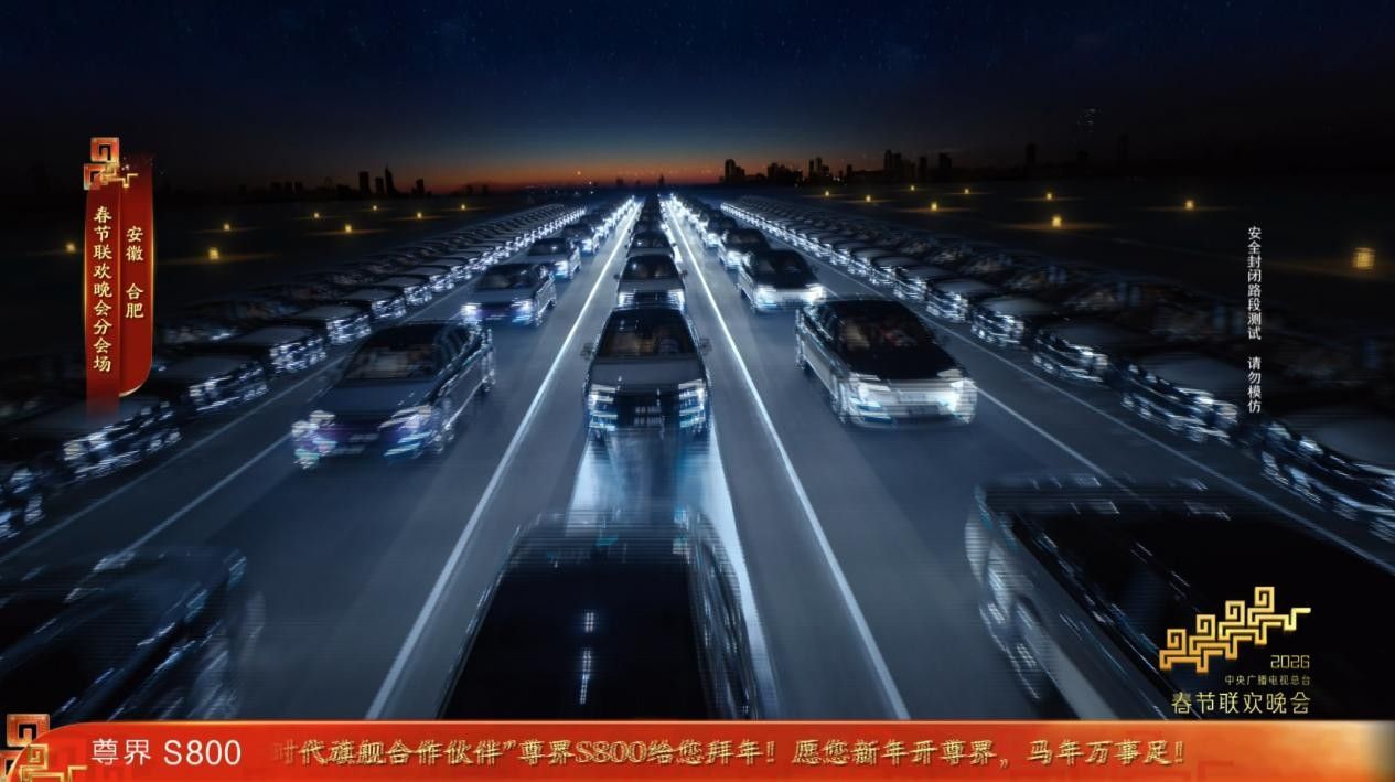 【车讯网 报道】 春节的欢腾余韵尚未散尽,回望除夕夜的央视春晚,一场关于智慧出行的视觉盛宴令人印象深刻。在合肥骆岗公园大道上,数台尊界S800组成的恢宏车阵以精准编队穿行而出,用科技与艺术的交融为传统佳节注入时代新意,让中国智造的硬核实力成为全球瞩目的焦点。