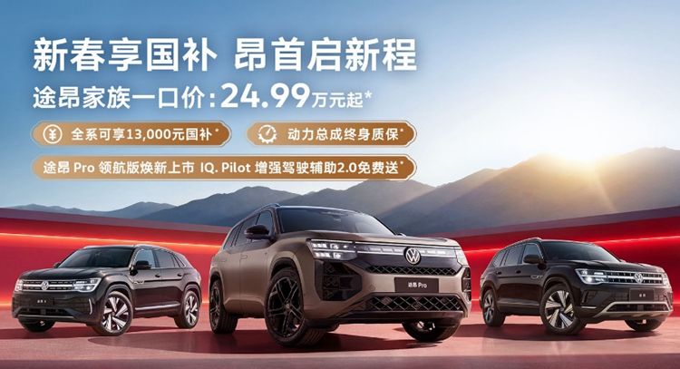 【车讯网 报道】2026年3月2日,上汽大众宣布:现在选购途昂家族全系产品的置换车主,均可在至高13,000元国家以旧换新补贴的基础上,再享多重惊喜权益,包括动力总成终身质保、至高5年0息、原厂数字钥匙。与此同时,途昂 Pro 2026款450TSI四驱领航版上市,惊喜一口价29.99万元起,增配不加价,免费享受IQ. Pilot增强驾驶辅助2.0。