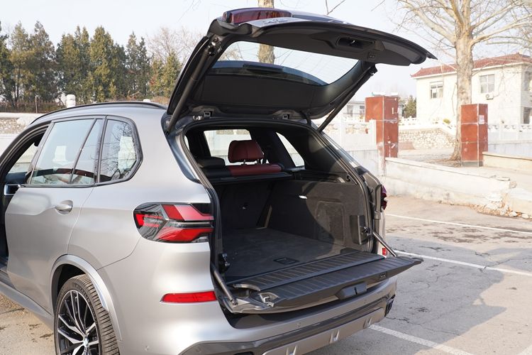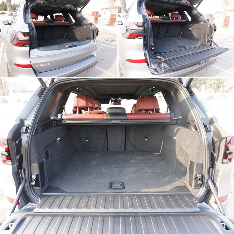 尾门是两段式,上半部分向上开启,下半部分向下开启,均为电动。由于该车身材高大,为方便使用,尾门上还有个按键,按一下,车身降低约60毫米。
