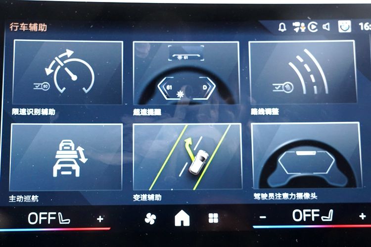 驾驶辅助方面,标配的主要功能是:车道保持、车道偏离预警、开门预警、前方碰撞预警、后方碰撞预警、倒车车侧预警、低速行车警告、主动制动、疲劳提示、并线辅助、辅助泊车、循迹倒车。