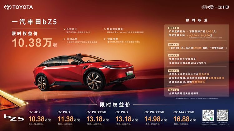 纯电车型bZ5在4月推出限时权益加码,置换权益升级为不限品牌厂补8000元,更可叠加9000-14600元的国家置换补贴,550JOY车型叠加厂补及国补后,限时权益价低至10.38万元。