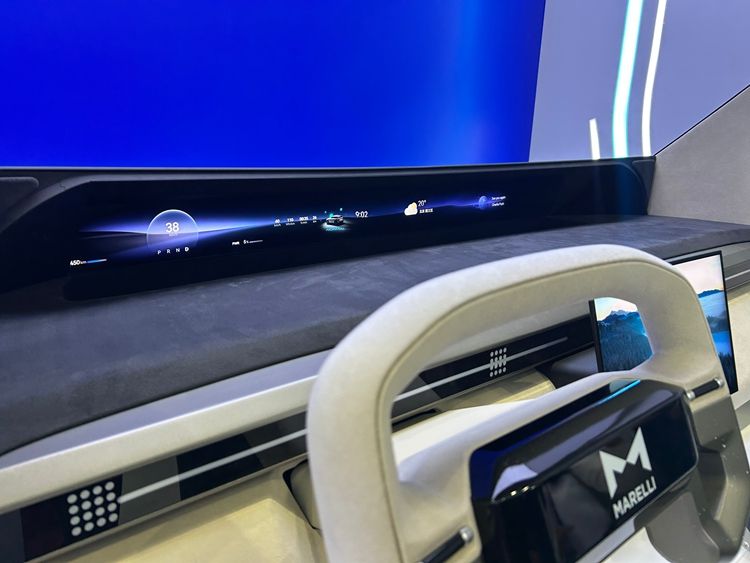 电子领域则聚焦智能座舱。随着用户体验、材料、人体工程学,以及更智能的信息娱乐呈现方式日益成为座舱设计核心,马瑞利展示多项先进座舱技术,包括超薄 MiniLED 曲面中控屏以及第二代黑镜显示器。