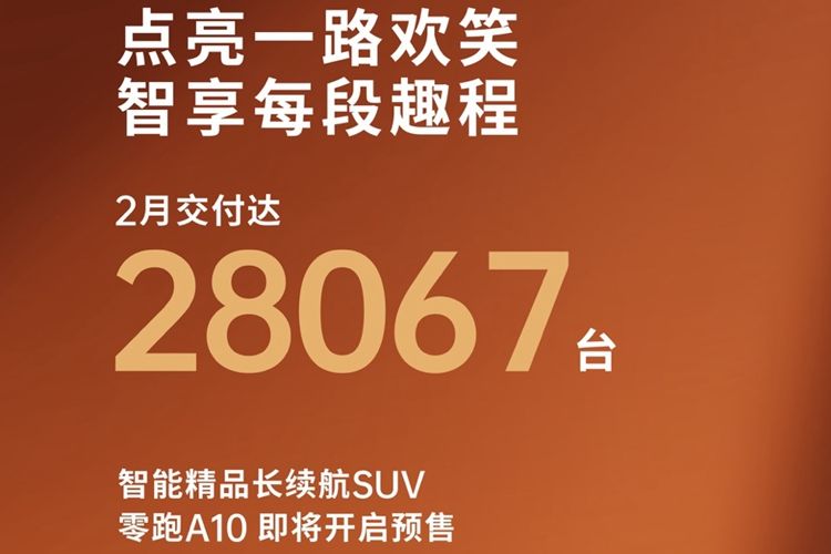 【车讯网 报道】根据厂家消息,零跑汽车在2026年2月份,终端销售28067台。零跑A10即将在3月份开启预售。